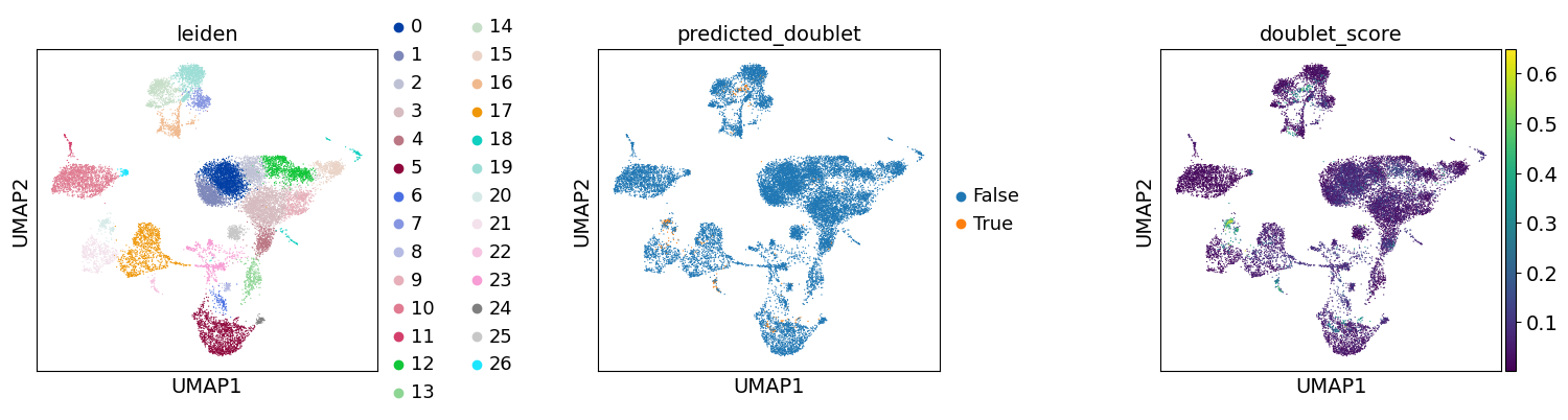color=["leiden", "predicted_doublet", "doublet_score"],