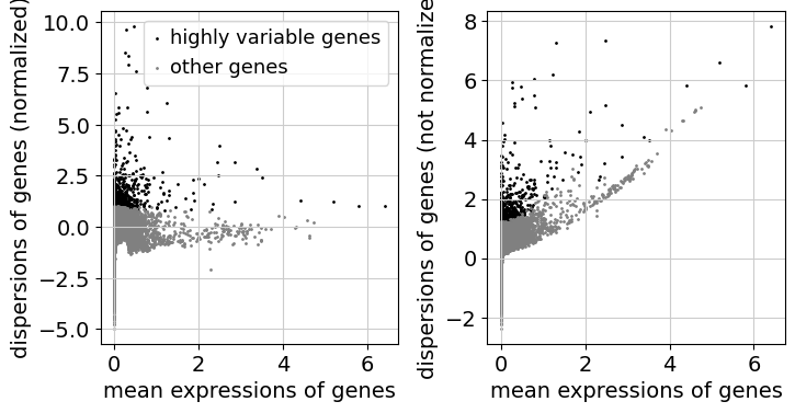 As a next step, we want to reduce the dimensionality of the dataset and only include the most informative genes. This step is commonly known as feature selection. The scanpy function pp.highly_variable_genes annotates highly variable genes by reproducing the implementations of Seurat [Satija et al., 2015], Cell Ranger [Zheng et al., 2017], and Seurat v3 [Stuart et al., 2019] depending on the chosen flavor.